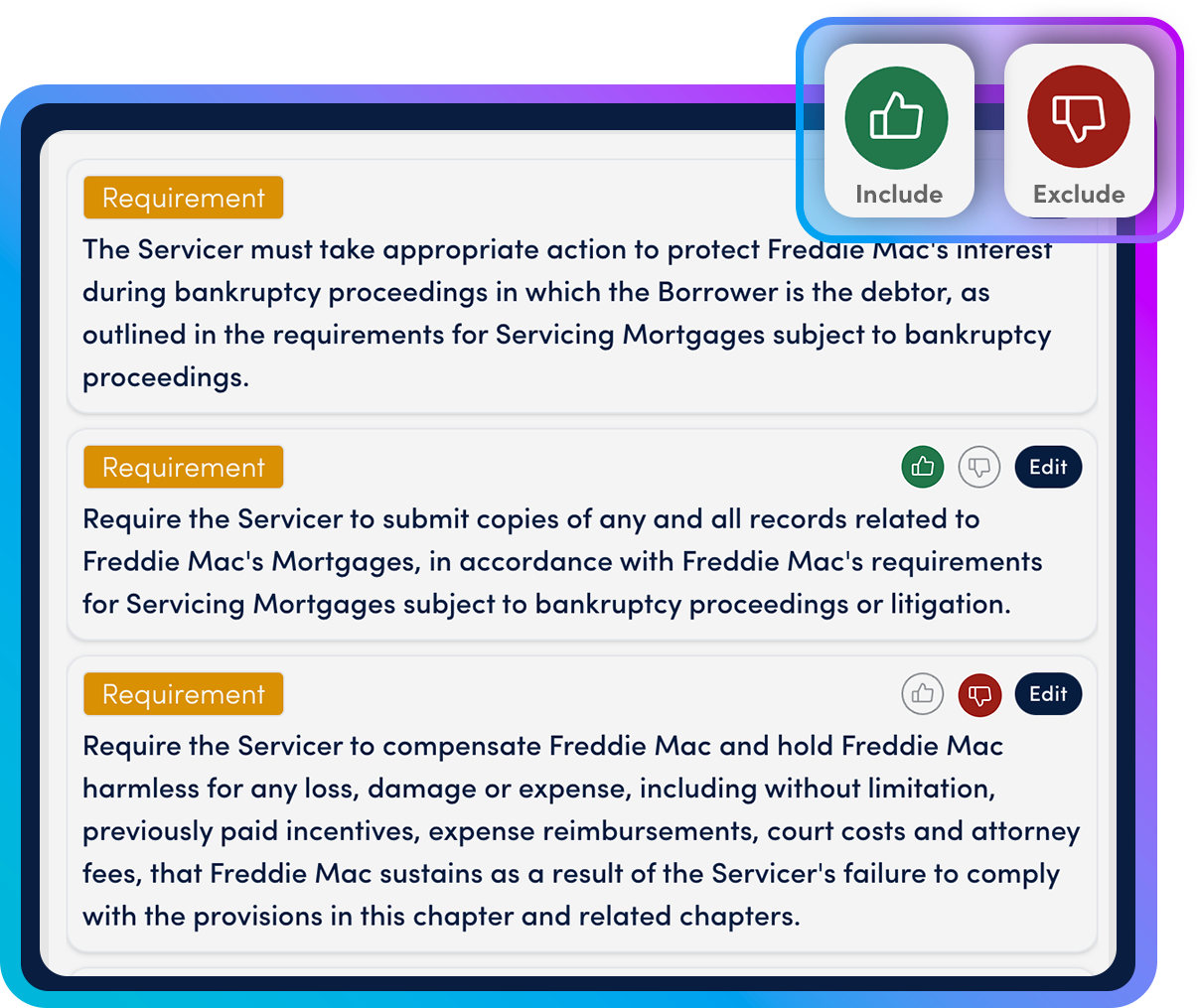 The core curation experience includes identifiers, configurable impact ratings, change type, markup text, and final change statements with traceability.